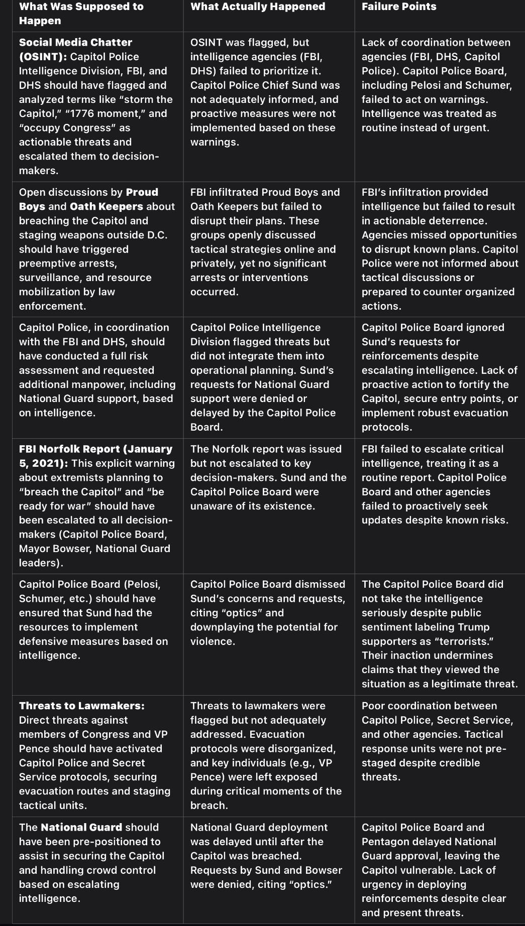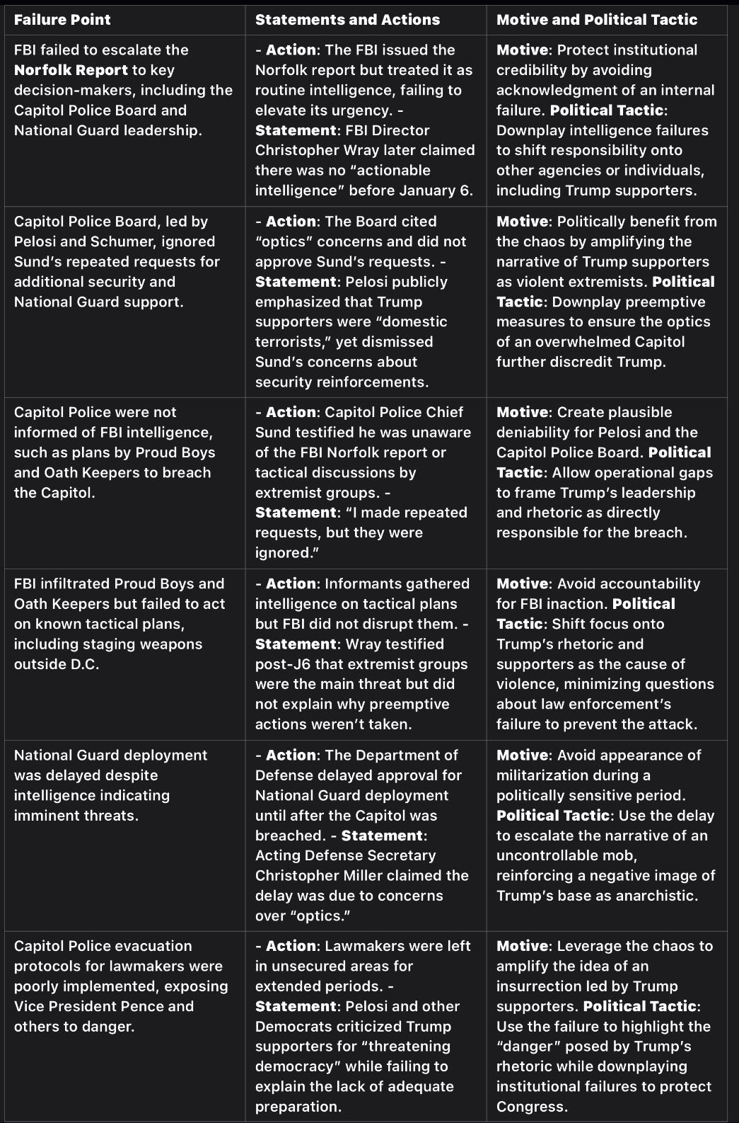 Many failure points align with motives to shift blame away from institutional incompetence and onto Trump’s so called “rhetoric” and “terrorist” supporters. For example, downplaying preemptive security measures helped reinforce the post-January 6 narrative of Trump’s culpability.