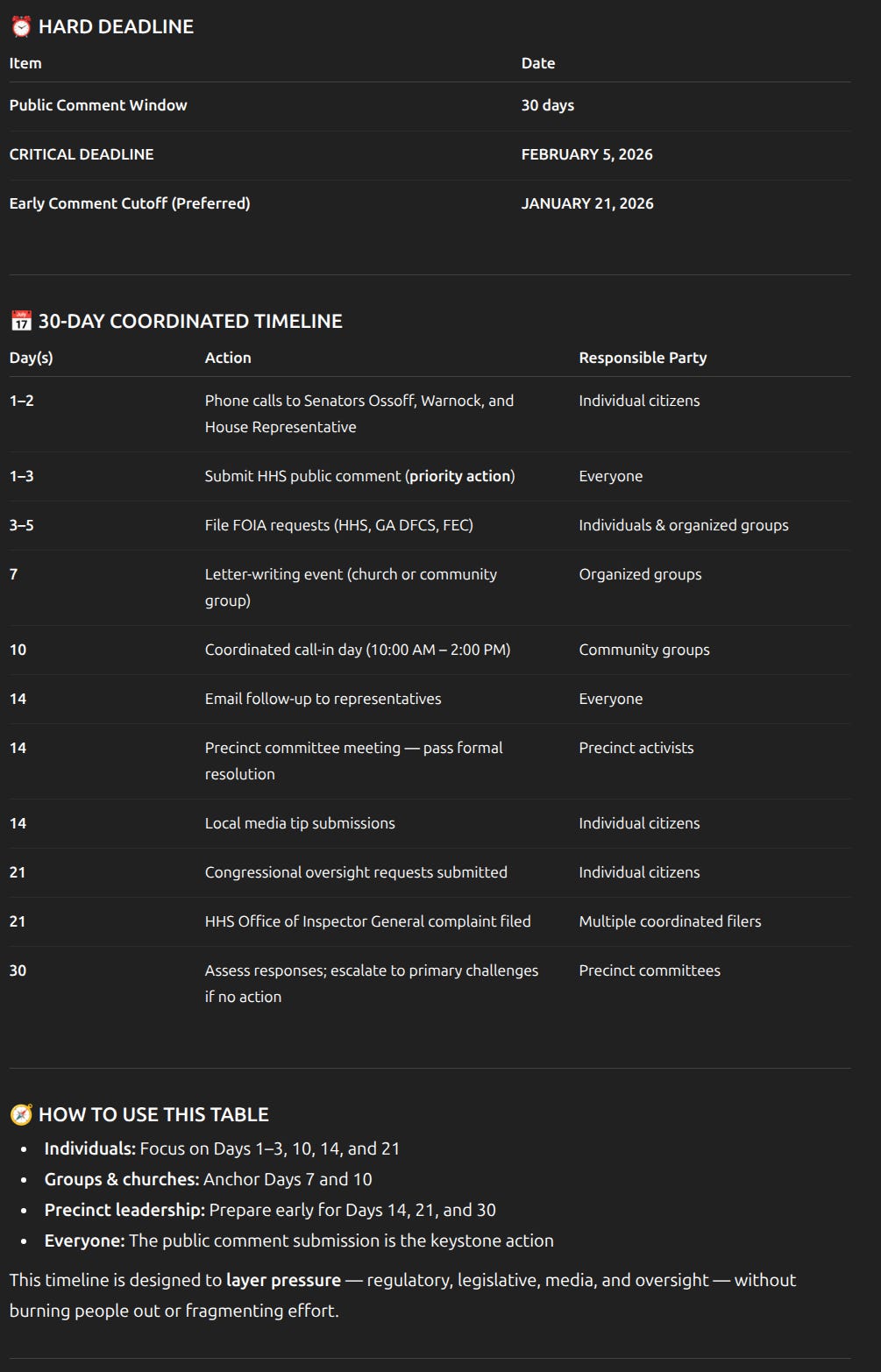 This timeline is designed to layer pressure â regulatory, legislative, media, and oversight â without burning people out or fragmenting effort.