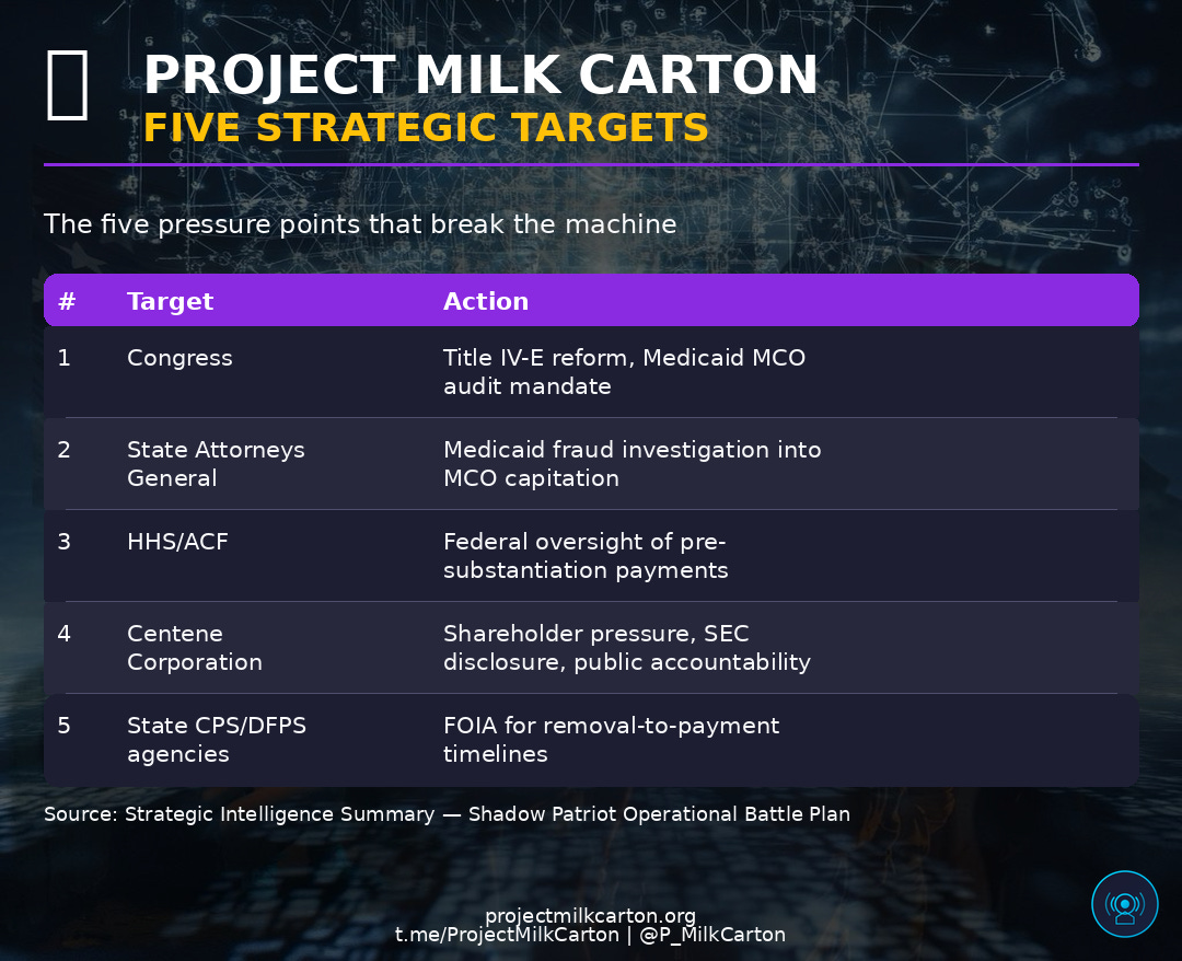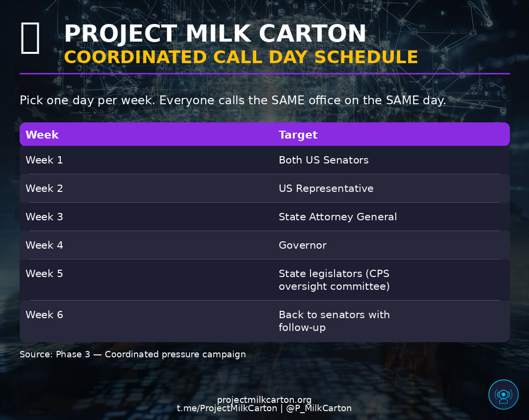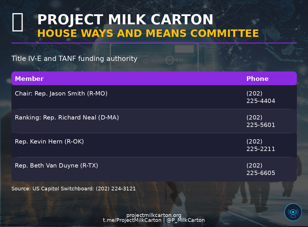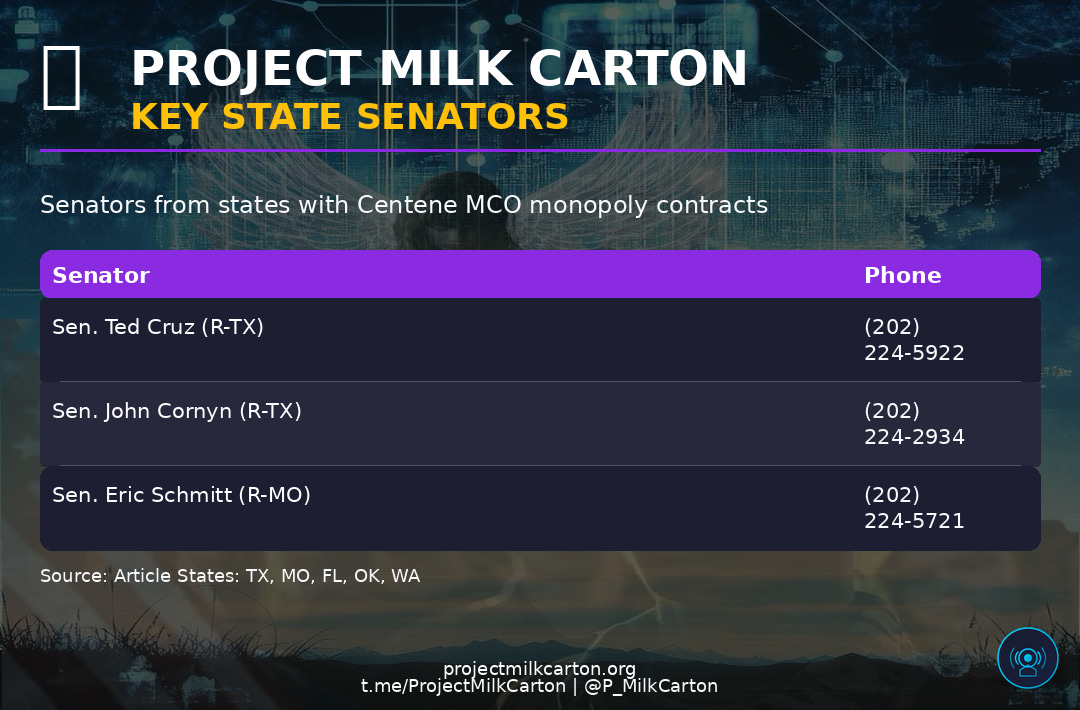 "Hello, my name is [YOUR NAME] and I'm a constituent from [CITY, STATE]. I'm calling about the child welfare-to-Medicaid pipeline. A forensic investigation by Project Milk Carton, a 501(c)(3), has documented that managed care organizations — particularly Centene Corporation — receive per-member-per-month capitation payments for children removed from their homes on an emergency basis BEFORE any investigation determines whether abuse or neglect actually occurred. In Texas alone, Centene's subsidiary Superior HealthPlan receives $1,556 per month per child — and 82% of investigated children are found NOT to be abuse or neglect victims according to HHS data. There is no clawback mechanism for these payments. I am asking [SENATOR/REPRESENTATIVE NAME] to: ONE — Request a GAO investigation into Medicaid MCO capitation payments for children in foster care during the pre-substantiation investigation period. TWO — Support legislation requiring a clawback mechanism for MCO payments when removals are found to be unsubstantiated. THREE — Hold hearings on Centene Corporation's monopoly foster care Medicaid contracts across multiple states. I would like a written response. My name again is [YOUR NAME], and my address is [ADDRESS]. Thank you."