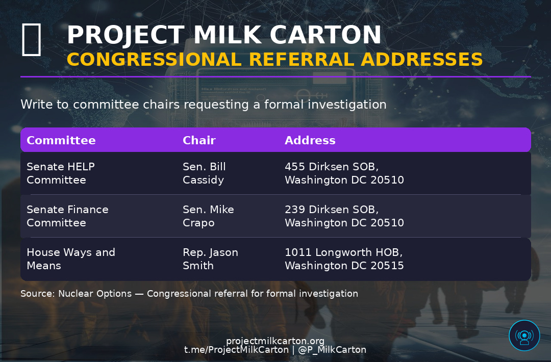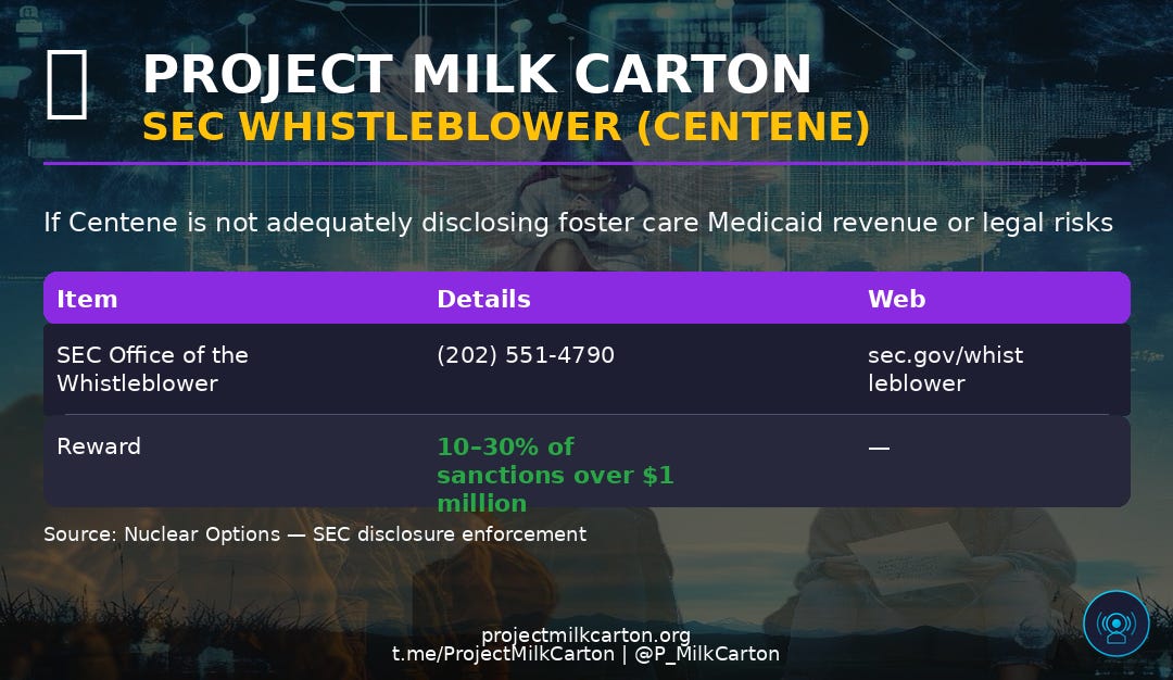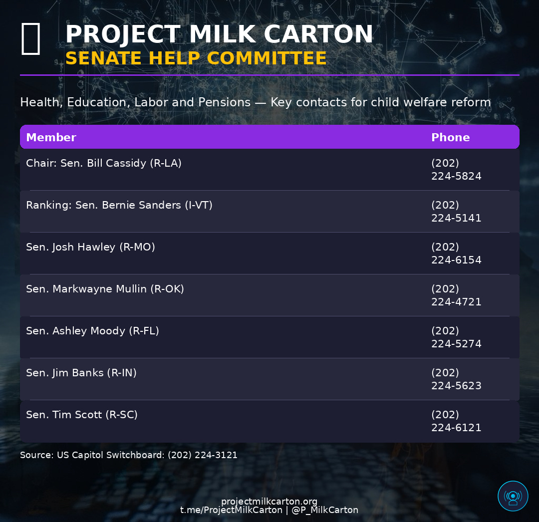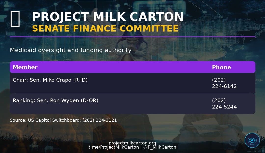 "Hello, my name is [YOUR NAME] and I'm a constituent from [CITY, STATE]. I'm calling about the child welfare-to-Medicaid pipeline. A forensic investigation by Project Milk Carton, a 501(c)(3), has documented that managed care organizations — particularly Centene Corporation — receive per-member-per-month capitation payments for children removed from their homes on an emergency basis BEFORE any investigation determines whether abuse or neglect actually occurred. In Texas alone, Centene's subsidiary Superior HealthPlan receives $1,556 per month per child — and 82% of investigated children are found NOT to be abuse or neglect victims according to HHS data. There is no clawback mechanism for these payments. I am asking [SENATOR/REPRESENTATIVE NAME] to: ONE — Request a GAO investigation into Medicaid MCO capitation payments for children in foster care during the pre-substantiation investigation period. TWO — Support legislation requiring a clawback mechanism for MCO payments when removals are found to be unsubstantiated. THREE — Hold hearings on Centene Corporation's monopoly foster care Medicaid contracts across multiple states. I would like a written response. My name again is [YOUR NAME], and my address is [ADDRESS]. Thank you."