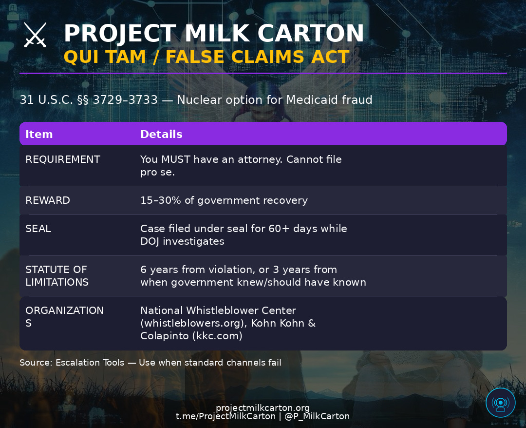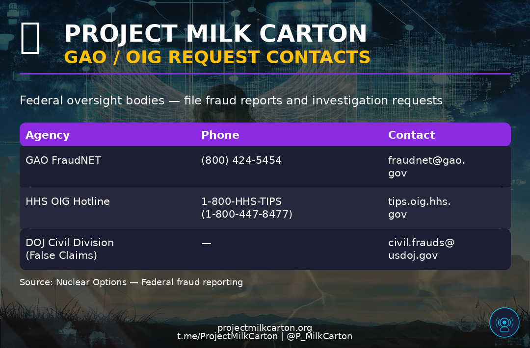 The investigation, conducted by Project Milk Carton (501(c)(3), EIN 33-1323547), analyzed 340 million records and $148 billion in tracked grants to document: