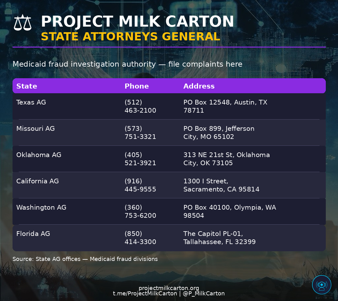 "Hello, my name is [YOUR NAME] from [CITY, STATE]. I'm calling to request that the Attorney General investigate potential Medicaid fraud in the state's child welfare managed care contracts. A forensic investigation has documented that managed care organizations receive per-member-per-month Medicaid capitation payments for children removed from their homes BEFORE any abuse or neglect finding is made. In [STATE], the MCO [NAME — e.g., Superior HealthPlan/Centene in TX] holds a [sole-source/dominant] contract covering foster children statewide. When the removal is ultimately found to be unsubstantiated — which happens in approximately 82% of cases nationally — there is no mechanism to recover the Medicaid payments already made. This may constitute Medicaid fraud under state and federal law if payments are being made for services predicated on a custody determination that was never substantiated. I am requesting: ONE — A formal investigation into the state's MCO contracts for foster care Medicaid. TWO — An audit of capitation payments made during pre-substantiation periods for children ultimately returned home. THREE — A review of whether the state's MCO contract structure creates financial incentives for unnecessary child removals. My contact information is [NAME, ADDRESS, EMAIL]. I would like a written response. Thank you."