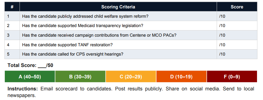 Create a “Child Welfare Accountability Scorecard” for every candidate in your district: