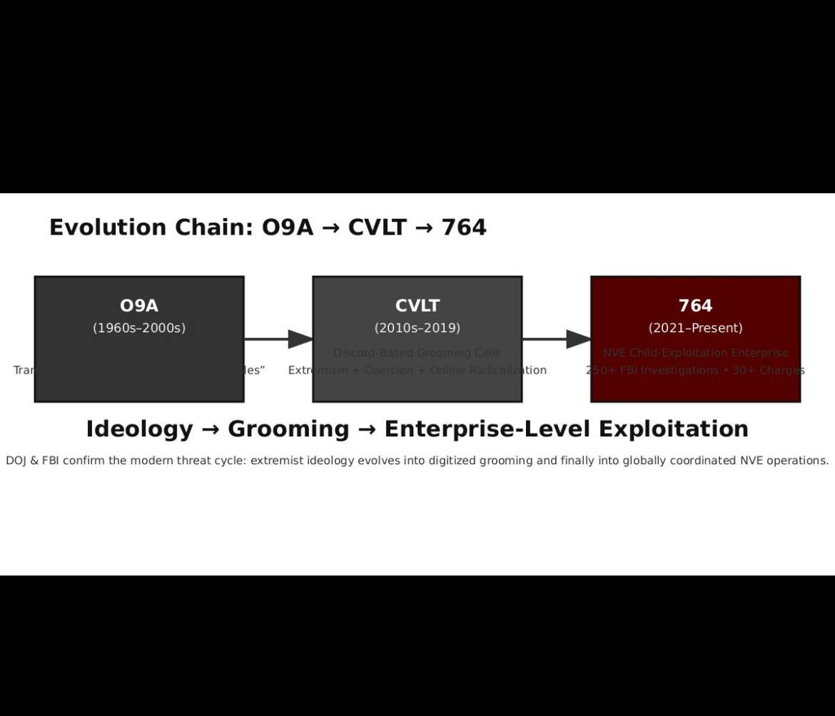 Claim in Article Federal Source Live Link (DOJ/FBI/Gov) O9A ideology includes exploitation, transgression, and “insight-role” style tactics influencing later digital extremist groups FBI Vault – Order of Nine Angles (O9A) – Part 01 (Final) (describes O9A’s emphasis on transgression, manipulation, boundary-breaking) https://vault.fbi.gov/order-of-nine-angles/Order%20of%20Nine%20Angles%20Part%2001%20(Final)/view Discord-based extremist grooming networks parallel earlier O9A-style coercive tactics DOJ prosecutions of Discord grooming and exploitation rings (Project Safe Childhood cases) establish online exploitation structures using manipulation & coercion https://www.justice.gov/psc FBI states that online extremist/grooming groups use gaming platforms, Discord, Telegram to target children FBI Congressional Testimony & FBI Public Advisories on online child exploitation (2023–2024) https://www.fbi.gov/news/testimony Fifth-gen warfare threat environment includes decentralized extremist grooming of minors FBI Director Wray congressional testimony on “blended threat vectors” & decentralized online extremism https://www.fbi.gov/news/testimony 764 founded by Bradley Cadenhead in 2021 DOJ Press Release – Leaders of 764 Arrested and Charged for Operating a Global Child-Exploitation Enterprise https://www.justice.gov/usao-dc/pr/leaders-764-arrested-and-charged-operating-global-child-exploitation-enterprise 764 described by DOJ/FBI as a “Nihilistic Violent Extremist (NVE)” group Same DOJ release — explicitly calls 764 an “NVE” organization https://www.justice.gov/usao-dc/pr/leaders-764-arrested-and-charged-operating-global-child-exploitation-enterprise FBI & DOJ report that 764 was the subject of over 250 investigations DOJ press release (above) — “investigated by the FBI in more than 250 cases” https://www.justice.gov/usao-dc/pr/leaders-764-arrested-and-charged-operating-global-child-exploitation-enterprise DOJ confirms over 30 charges/indictments involving 764 Same DOJ release — “more than 30 individuals charged” https://www.justice.gov/usao-dc/pr/leaders-764-arrested-and-charged-operating-global-child-exploitation-enterprise 764 used encrypted platforms, organized tasks/missions, and targeted minors DOJ 764 enterprise indictment details organizational structure https://www.justice.gov/usao-dc/pr/leaders-764-arrested-and-charged-operating-global-child-exploitation-enterprise FBI arrests 764-linked offenders for CSAM FBI: Downey Man Suspected of Membership in the 764 Nihilist Violent Extremist Group Arrested for Possession of Child Pornography https://www.fbi.gov/contact-us/field-offices/losangeles/news/downey-man-suspected-of-membership-in-the-764-nihilist-violent-extremist-group-arrested-for-possession-of-child-pornography FBI labels 764 as “nihilist violent extremist group” Same as above — FBI explicitly uses this designation in the arrest notice https://www.fbi.gov/contact-us/field-offices/losangeles/news/downey-man-suspected-of-membership-in-the-764-nihilist-violent-extremist-group-arrested-for-possession-of-child-pornography Online sextortion/extortion of minors is increasing in decentralized cells FBI IC3 Public Advisory & Annual Reports