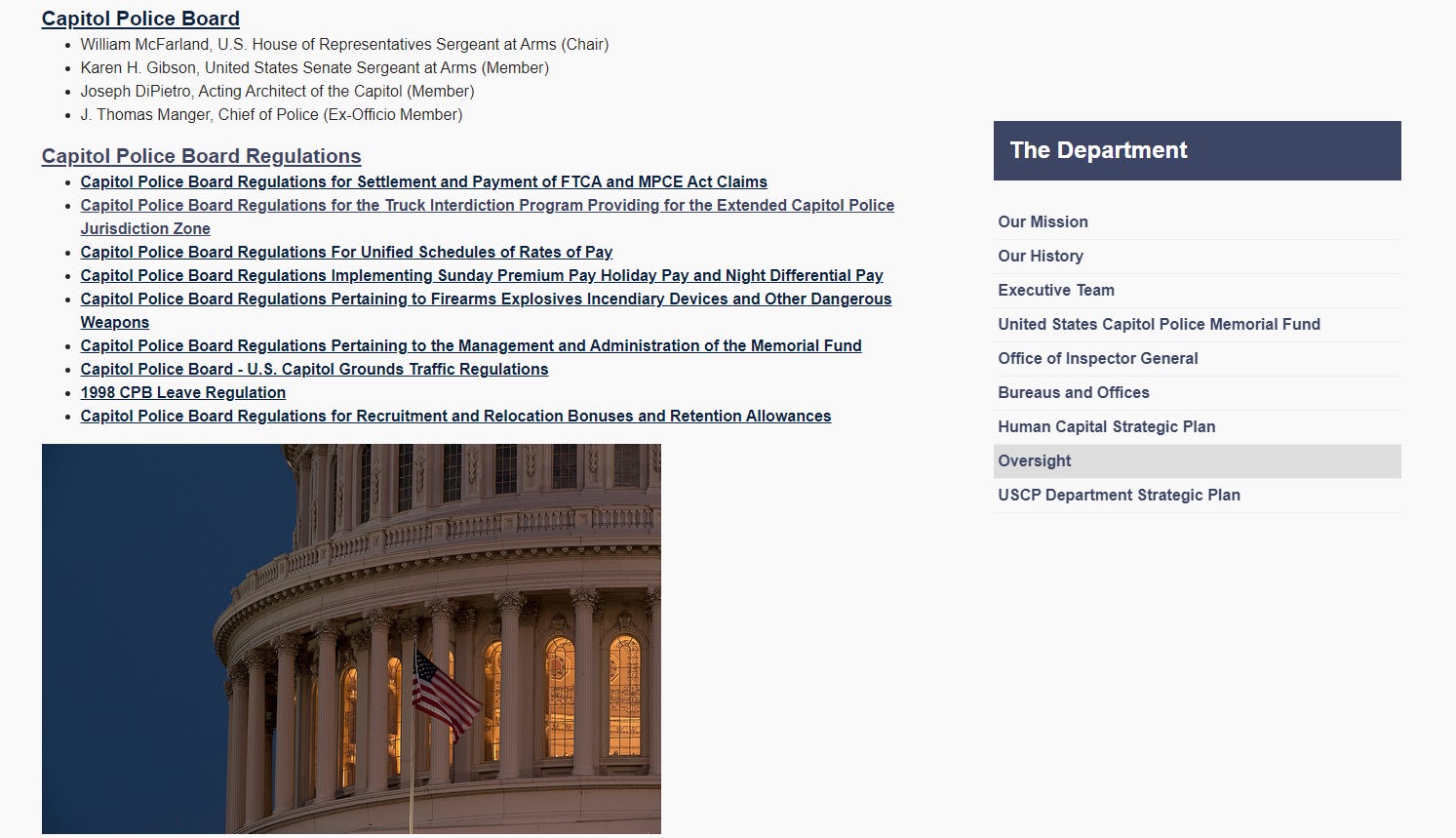 Today, the Capitol Police is overseen by the Capitol Police Board, which consists of the Sergeants at Arms of the House and Senate, as well as the Architect of the Capitol. The Chief of the Capitol Police reports to the Board and is responsible for the day-to-day management of the agency.