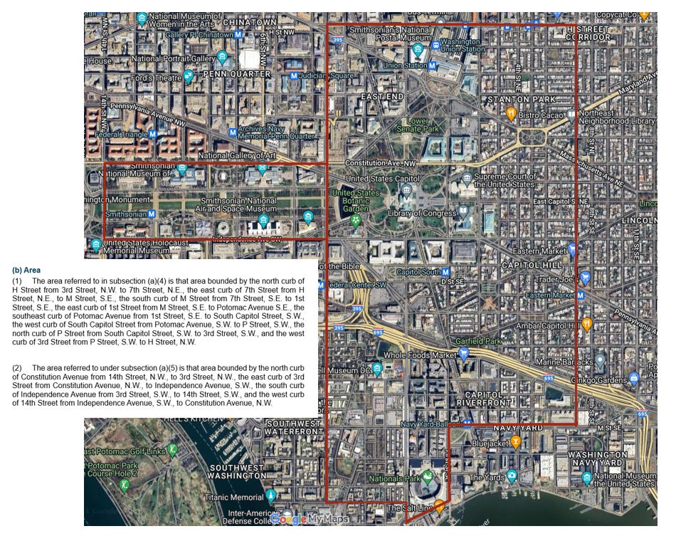 The Capitol Police's authority to make arrests and enforce laws extends to specific areas within the District of Columbia, as described in §1967(b)(1) and (2).