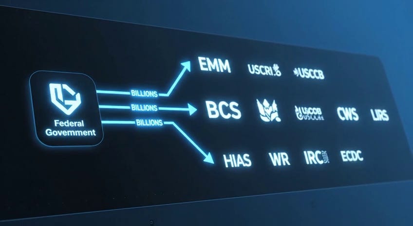 The ten VolAgs — IRC, HIAS, LIRS, USCCB, CWS, World Relief, Bethany, USCRI, ECDC, EMM — are the “cartel families”. They are networked, coordinated through RCUSA, and they share a collective interest: keep the system humming. They pass contracts down to 360 affiliates across the country, giving the appearance of community-based charity.