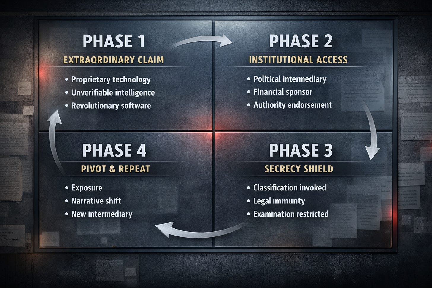 EDITORIAL NOTE: This investigation is built entirely on public records: federal court filings, state criminal dockets, congressional testimony, IRS filings, domain registration records, and on-the-record statements from named individuals including attorneys, federal judges, intelligence officials, and the subjects themselves. Where we assess patterns or draw analytical conclusions, we say so explicitly. Where questions remain unresolved, we flag them. We are not the first to investigate Dennis Montgomery — NPR, the New York Times, ProPublica, Playboy, and PBS have all covered aspects of this story. What we believe is new is the complete structural mapping of how a single fabricator’s claims traveled through a network of intermediaries to influence national policy, drain hundreds of millions in private wealth, and send at least one person to prison for nine years.