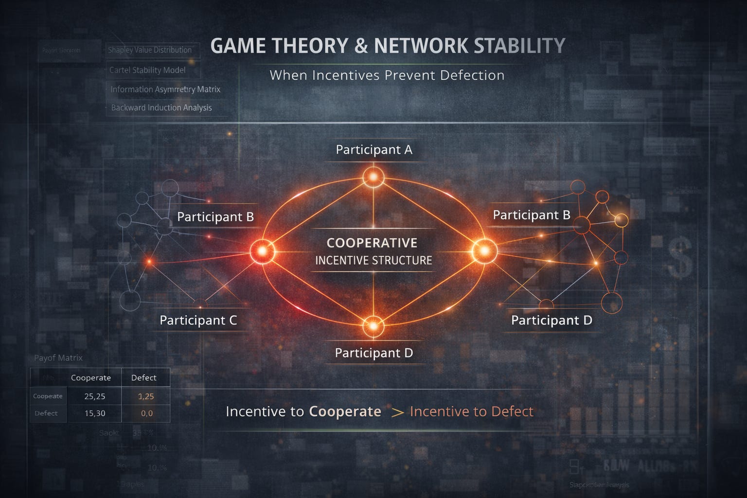 EDITORIAL NOTE: This article applies standard game theory frameworks — Shapley values, cartel stability analysis, information asymmetry modeling, and backward induction — to the documented behavior of the Montgomery network. These are the same mathematical tools used by economists to study cartels and by intelligence analysts to model adversarial networks. The inputs are documented facts. The outputs are analytical assessments, clearly labeled as such.