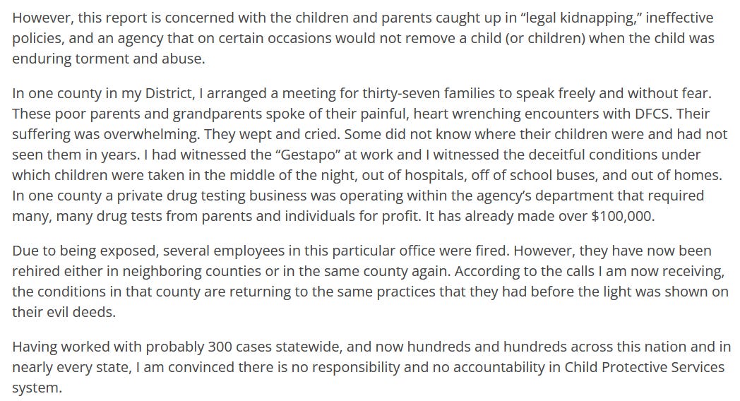 General Foster Care System Performance: It's reported that about 95% of the time when state agencies take children away from families, the accusations are false or unsubstantiated. Furthermore, outcomes for children who spend any time in foster care are mostly negative, with occurrences of abuse, assault, over-medication, and trafficking. These children are more likely to experience depression, attempt suicide, become pregnant, or end up in jail at an early age.