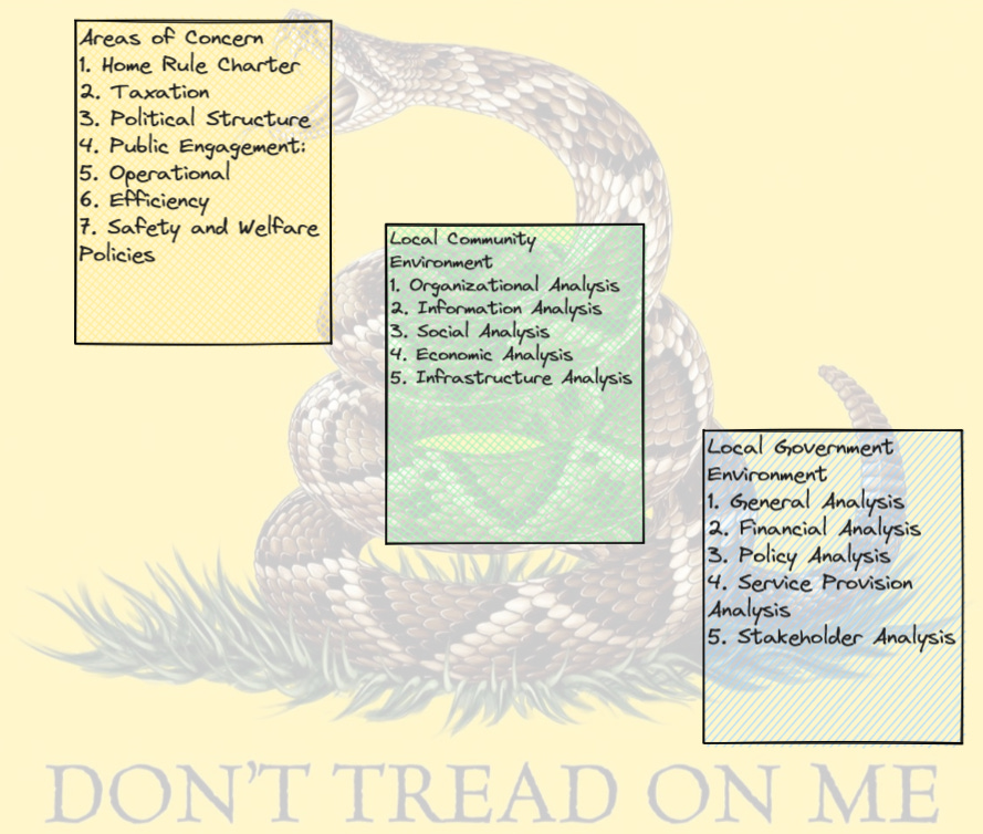 The scope of the analysis is comprehensive, but it is designed to provide a holistic understanding of the local government and community environment. It's important to note that not all of these analyses need to be conducted simultaneously or by every citizen. They can be approached as a collective effort, with different individuals or groups focusing on different aspects based on their interests, expertise, or the specific concerns they have about the community. Here's is an example approach: